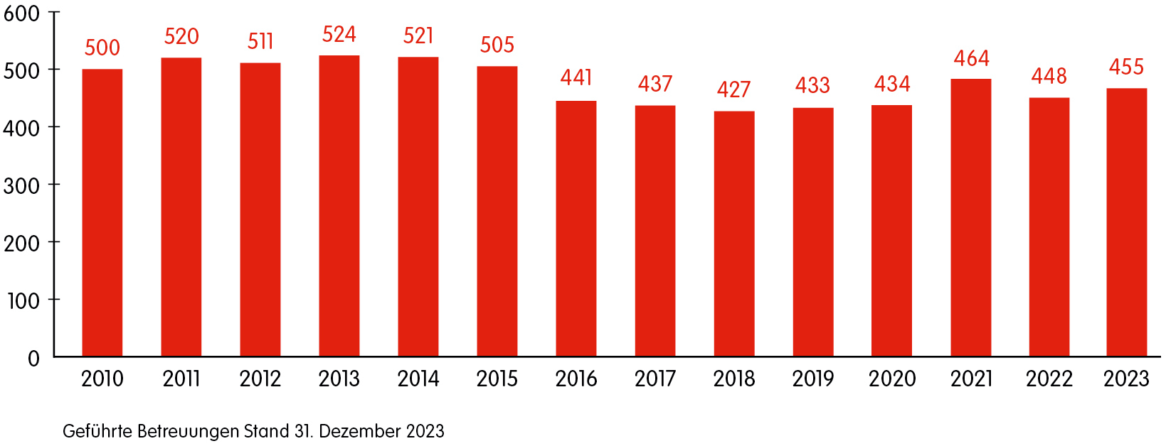 Stand das Verhältnis über Jahre hinweg ⅓ ehrenamtliche Betreuungen zu ⅔ berufliche Betreuungen, so hat sich in 2023 das Verhältnis ca. ¼ ehrenamtliche Betreuungen zu ¾ beruflich geführter Betreuungen entwickelt.